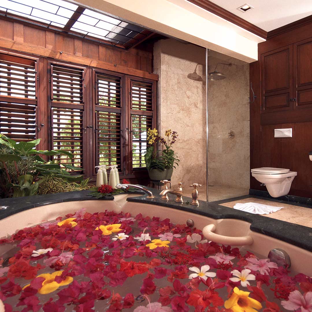 Unrivaled Elegance. The two master bedrooms, decorated with Asian antiques and custom-made furnishings, boast stunning views and luxurious en-suite bathrooms. Grand four-poster beds, private balconies, and spaces filled with natural light create the perfect atmosphere for a relaxing getaway. Each bathroom serves as a personal sanctuary, featuring marble, slate, and natural stone elements, along with a Jacuzzi and rain showers beneath a softly lit, mosquito-netted ceiling.